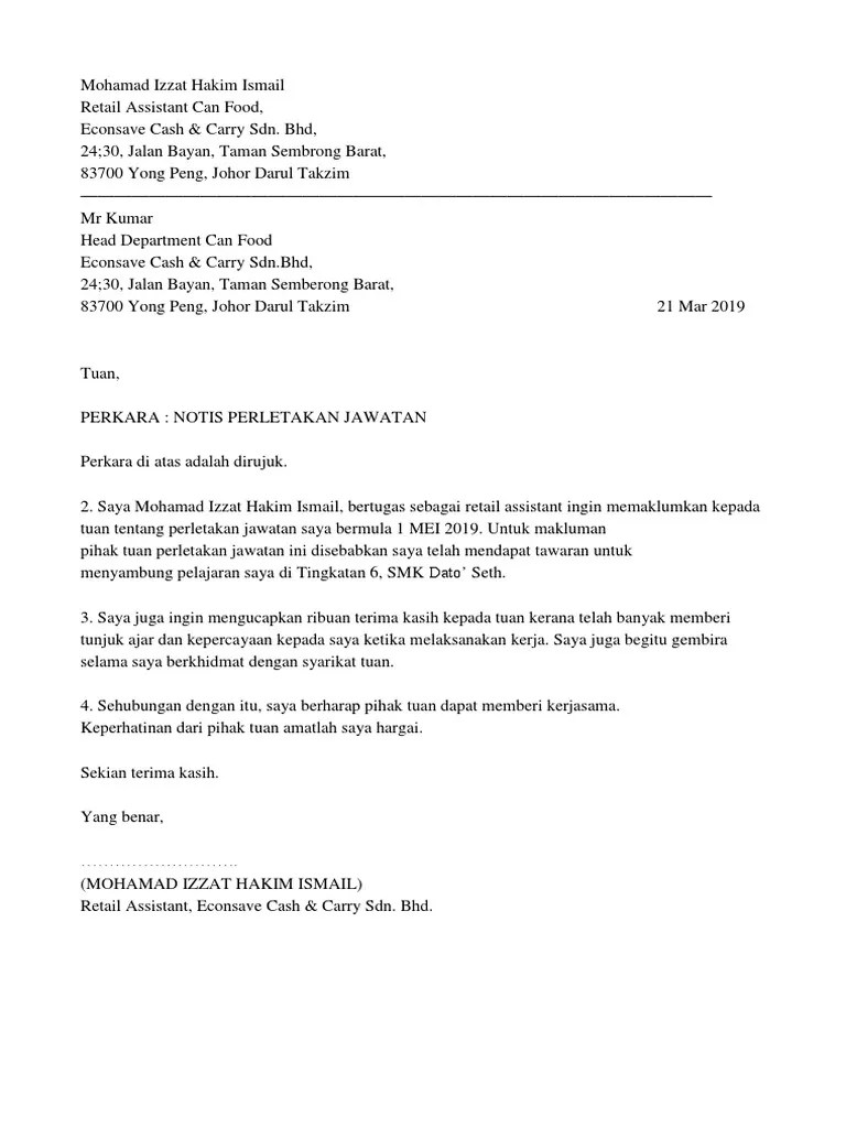 Notis berhenti kerja termasuk sebulan dan 24 jam. Surat ni aku create time nk berhenti kerja kilang wong engineering. Diharapkan pihak tuan dapat mempertimbangkan notis saya ini dan segala jasa baik dan kerjasama dari pihak tuan sepanjang saya berkhidmat di sini amatlah dihargai. Dalam keadaan biasa, ia adalah tipikal untuk memberikan notis dua minggu kepada majikan anda apabila anda berhenti kerja anda. Ini adalah kerana supaya anda tidak dikenakan sebarang tindakan oleh pihak syarikat.
